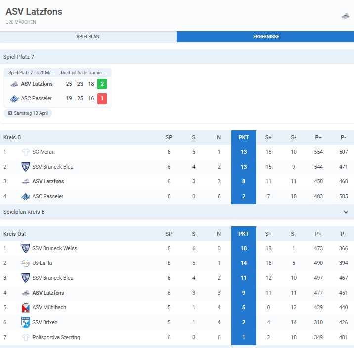 Spielplan, Ergebnisse und Tabelle U20