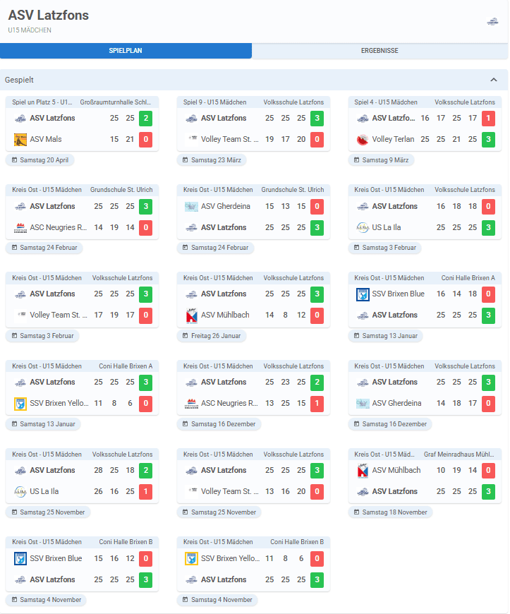 Spielplan, Ergebnisse und Tabelle U15
