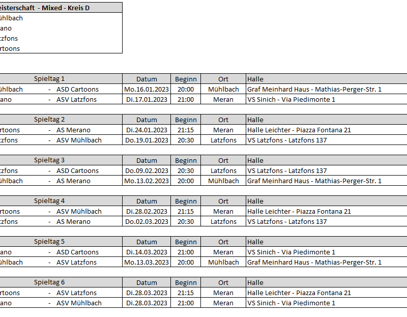 Spielplan, Ergebnisse und Tabelle Mixed